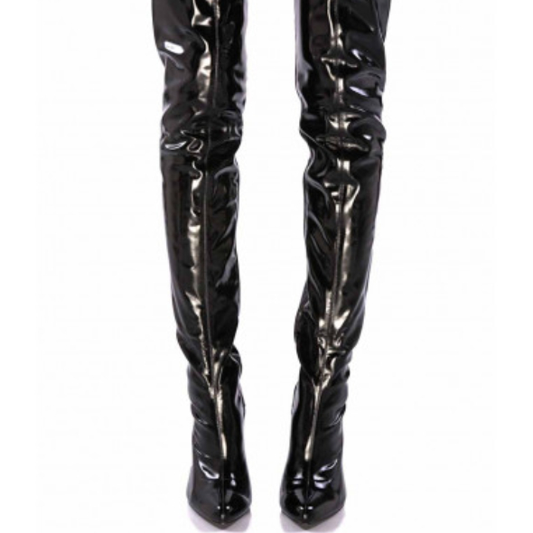 Ces cuissardes en simili-cuir verni, également appelées cuissardes vinyle sans plateforme, sont un choix parfait pour celles qui souhaitent ajouter une touche audacieuse et glamour à leur tenue. Leur finition brillante et leur design ajusté mettent en valeur les jambes, offrant un look à la fois sensuel et sophistiqué.
